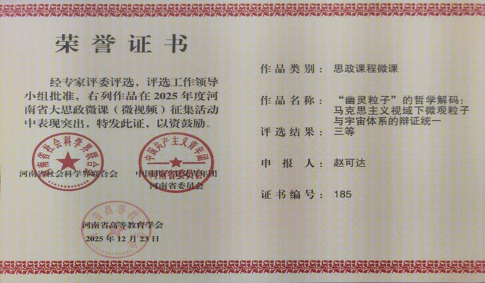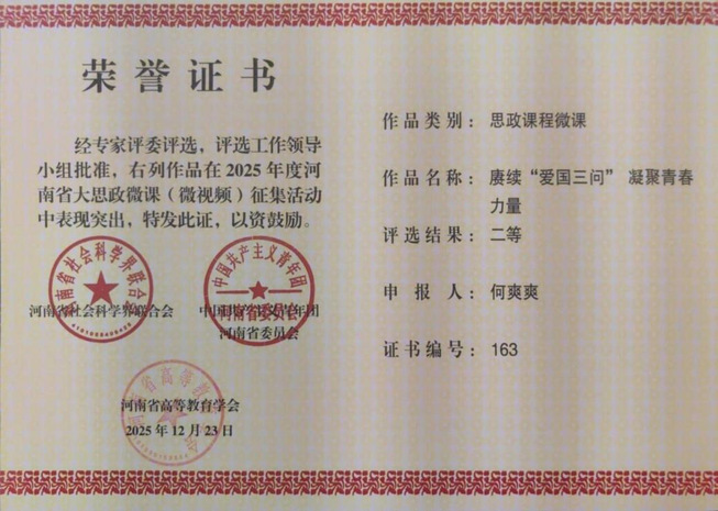 2025年12月23日,河南省社科联、共青团河南省委、河南省高等教育学会2025年度河南省大思政微课(微视频)征集活动评选结果公布,我院教师何爽爽荣获二等奖,教师赵可达、姜泽慧、邢雪蕊和张荷荣获三等奖。